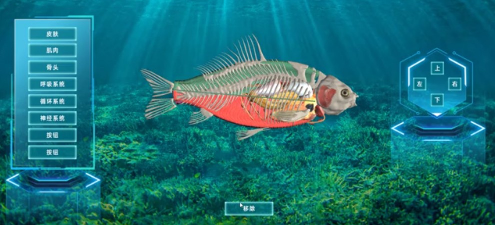 我司虚拟鱼类学仿真软件能够提供50余种鱼类3D仿真、针对鱼的形态结构,能做测量、解剖讲解;针对鱼的肌肉、皮肤组织、循环系统等,能提供虚拟解剖、组织分离及复原等操作;针对鱼的品种、门类,我司开发了水族馆虚拟仿真系统,学生科普学习的同时兼具互动任务。